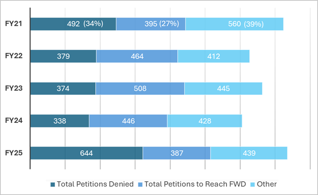 As shown by the chart above, the percentage of petitions denied institution in FY25 increased by at least 10% over the last five years, while the percentage of petitions to reach final written decisions decreased by at least 10%. Notably, the number of petitions to request adverse judgment, settle, or be dismissed remained relatively consistent, which indicates that this category of outcomes did not impact the institution rate.
